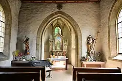 Die Wolfgangskapelle ist ein spätgotischer Bau mit Dachreiter und Spitzbogenfenstern, an deren Laibungen einige mittelalterliche Bemalungen erhalten sind, ebenso in den Gewölbefeldern des Altarraums. Sie ist mit einem vieleckigen Chor errichtet und hat innen drei Altäre. Überspannt ist der Chor durch ein Netzgewölbe mit fünf Schlusssteinen. Der neugotische Hauptaltar stellt den heiligen Wolfgang mit der Streitaxt bildlich dar, das Holztafelbild des Altars (Predella) die vierzehn Nothelfer mit der Gottesmutter.