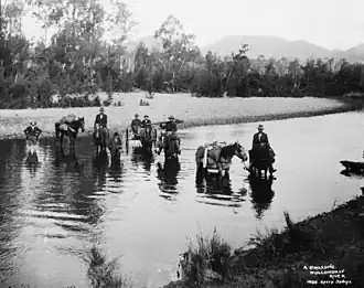 ![]() Ein Trek überquert den Wollondilly River (ca. 1900). Foto aus dem Powerhouse Museum in Sydney | ||
