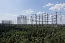 - Bei der Anlage Duga-1 (oft in anderer Zählweise auch fälschlich als Duga-3 bezeichnet) nahe Tschernobyl sind Sender (51° 38′ 16″ N, 30° 42′ 10″ O) und Empfänger (51° 18′ 19″ N, 30° 3′ 57″ O) rund 50 Kilometer voneinander entfernt. Die Empfangsanlage bestand aus rund 50 Großantennen mit einer Höhe bis zu jeweils 150 Metern. Die Reichweite lag bei 9000 Kilometern.[4] Die Sendeanlage bestand aus zwei in Linie errichteten Anlagen unterschiedlicher Größe. Für den Betrieb der Anlage und die Auswertung der Daten waren zahlreiche Fachleute erforderlich, die in einer Siedlung von rund 2000 Menschen direkt in der Nähe des Empfängers wohnten. Nach der Katastrophe von Tschernobyl musste dieser Standort aufgegeben werden.[4] Die Sendeanlage bei Ljubetsch wurde teilweise demontiert und in Komsomolsk am Amur aufgebaut, die Empfängeranlage liegt in der Sperrzone von Tschernobyl und existiert heute noch[5].