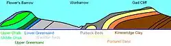 ![]() Blick auf die Steilküste in der Worbarrow Bay, aufgenommen von einem Ort mit dem Flurnamen Gold Down. Die Blickrichtung ist in etwa Nordwest. Im oberen Teil des Bildes ganz links ist der Eingang in die Bay of Arish Mell zu sehen. Rechts daneben der Felsen von Cow Corner, wiederum rechts daneben das Kliff des Rings Hill. Oberhalb von Cow Corner, im Bildhintergrund, das Dorf Burngate. Die weißlichen Steilwände bestehen aus Kalksteinen der Oberkreide („Chalk“), das bräunliche Kliff in der rechten Bildmitte besteht überwiegend aus Sandsteinen der Unterkreide („Wealden“). | ||