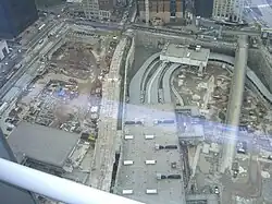 Station World Trade Center grenzt an Greenwich Street und darunter verlaufende städtische U-Bahn-Strecke an. Blick südwärts 2006 aus 7 WTC auf die nach Zerstö­rung 2001 an gleicher Stelle neu aufgebaute Station.
