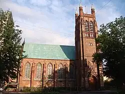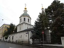 - Hausnummer 8/5. Das Ensemble der anglikanischen Kirche St. Andrej.[3] Die einzige anglikanische Kirche in Moskau wurde 1882–1884 nach dem Plan des Architekten Richard Freeman errichtet. Die einschiffige Basilika im Viktorianischen Stil hat einen Turm, der allerdings keine Glocken trägt. Unter der Sowjetherrschaft wurde die Kirche für Gottesdienste geschlossen. Auf Ansuchen von Elisabeth II. während ihres Besuchs in Moskau 1994 veranlasste Boris Jelzin die vollständige Rückgabe des Gebäudes an die Gemeinde. 2017 weilte hier der Erzbischof von Canterbury Justin Welby zu einem Besuch. Die erste Orgel der Kirche ist nicht erhalten. Eine zweite Orgel wurde Anfang 2019 installiert. Neben der Kirche befindet sich ein zweistöckiges Wohnhaus für den Kaplan. Der Kirche verfügt über eine Bibliothek und eine Sonntagsschule. Gottesdienste werden auf Englisch durchgeführt.