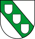 Blasonierung: „In Silber ein grüner Schrägrechtsbalken, belegt mit drei silbernen Schilden.“[10] |