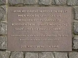 Die Wuppertaler Gewerkschaftsprozesse fanden eine große Resonanz in der internationalen Arbeiterbewegung und gelten als Symbol des Massenwiderstands gegen den Nationalsozialismus. 1995 wurde ein Mahnmal zur Erinnerung an die Wuppertaler Gewerkschaftsprozesse der Bildhauerin Ulle Hees am Landgericht Wuppertal enthüllt, weitgehend finanziert aus privaten Spenden.[3] Im Treppenhaus des Landgerichtsgebäudes erinnert zudem ein „Mahnfenster“ an „Justizunrecht in der Zeit des Nationalsozialismus“.[4] Im November 2005 jährte sich zum 70. Mal der Beginn des ersten Verfahrens der Prozess-Serie. Aus diesem Anlass wurde eine umfangreiche Website zu diesem Thema erstellt wie auch eine Ausstellung.