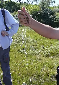 ![]() Fruchtstände des Wollgrases (Eriophorum sp.) Ende Mai | ||