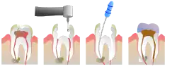 - Ist der Zahn bereits devital, ist das Ziel der Behandlung die Entfernung der gangränösen Pulpa und der Keime aus dem Zahninneren. Nach der Eröffnung des Zahnes wird auch hier – wie bei der Vitalexstirpation – das System der Wurzelkanäle ausgefeilt und gereinigt.
