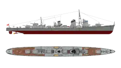Die Yūgumo Klasse war eine Wiederholung der vorhergehenden Kagerō-Klasse mit einigen Verbesserungen. Der Erhöhungswinkel der sechs 12,7-cm-Geschütze wurde von 55° auf 75° erhöht, um die Flugabwehr zu erleichtern, die Brücke wurde stromlinienförmig, um den Luftwiderstand zu verringern und die Stabilität zu verbessern, die Dreibeinmasten wurden verändert, um Radarantennen zu tragen. Im Laufe des Krieges wurde ein Typ-22-Seezielradar und ein Typ-13-Luftzielradar eingebaut.[1]