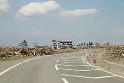 Der Tsunami zerstörte nicht nur den Küstendeich, sondern entwurzelte auch alle Bäume und riss sie landwärts mit sich.[3][4] Die Kiefern des Küstenwaldes wurden durch den Tsunami weitgehend zerstört, indem sie umgekippten und ihre Stämme sehr nahe am Boden umgebrochen wurden. Der Küstenwald erzeugte in der Folge erhebliche Mengen an Trümmern. Es konnte gezeigt werden, dass solche Trümmer strukturelle Schäden an einem 1 km landeinwärts gelegenen Stahlrahmen-Landwirtschaftsgebäude verursachten, das nicht nur seine Verkleidung bis in 4 m Höhe verlor, sondern beim Vordringen des Tsunamis auch von einem Baumstamm getroffen wurde, der tragende Elemente verbog.[1]