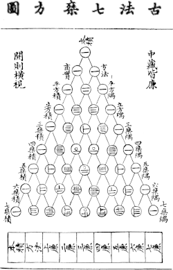 Yang-Hui-Dreieck (pascalsches Dreieck) wie es in einem Buch von Zhu Shijie aus dem Jahre 1303 beschrieben ist.