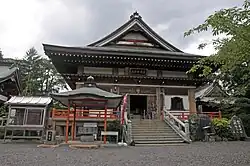 Man betritt die Tempelanlage durch ein schmales Tempeltor (山門, Sammon; 1), steigt eine Treppe hoch, passiert links die Tempelglocke (鐘楼, Shōrō; 6) und hat dann die Haupthalle (本堂, Hondō; 2) vor sich. Weiter links steht oben die Halle, die dem Tempelgründer gewidmet ist, die Daishidō (大師堂; 3). Zwischen Haupthalle und Daishidō steht die kleine Emmadō (焔魔堂, auch 閻魔堂 geschrieben; 4) und ganz rechts der Schrein Kumano-Nijūsha Gongendō (熊野十二社権現堂; 5). Am Rande des Geländes steht die im Jahr 2005 errichtete Gruppe aus Stein, nämlich der heilige Fudō mit zwei kleinen Begleitern (不動三尊).