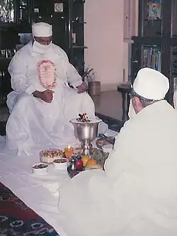 Während, wie aus sassanidischer Zeit attestiert, früher die Rezitation durch acht zoroastrische Priester (mittelpersisch: „Magu-pat“, neupersisch „Mobed“)[7] erfolgte, wird sie heute in der Regel durch zwei ausgeführt. Der Zelebrant ist der Zut (Avestisch: Zaotar), und seine Assistenz, die auch für die Vorbereitungen zuständig ist, sind ein oder mehrere Raspis.