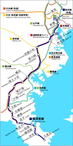 | Zweigleisigkeit: | Tokio – Yokosuka | ||||||||||||||||||||||||||||||||||||||||||||||||||||||||||||||||||||||||||||||||||||||||||||||||||||||||||||||||||||||||||||||||||||||||||||||||||||||||||||||||||||||||||||||||||||||||||||||||||||||||||||||||||||||||||||||||||||||||||||||||||||||||||||||||||||||||||||||||||||||||||||||||||||||||||||||||||||||||||||||||||||||||||||||||||||||||||||||||||||||||||||||||||||||||||||||||||||||||||||||||||||||||||||||||||||||||||||||||||||||||||||