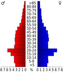 Auf das gesamte County bezogen setzte sich die Bevölkerung zusammen aus 25,20 % Einwohnern unter 18 Jahren, 18,30 % zwischen 18 und 24 Jahren, 28,20 % zwischen 25 und 44 Jahren, 18,90 % zwischen 45 und 64 Jahren und 9,40 % waren 65 Jahre alt oder darüber. Das Durchschnittsalter betrug 30 Jahre. Auf 100 weibliche Personen kamen 95,60 männliche Personen, auf 100 Frauen im Alter ab 18 Jahren kamen statistisch 92,20 Männer.