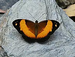 Die Flügelspannweite der Falter beträgt durchschnittlich 67 bis 69 Millimeter, wobei die Weibchen etwas größer als die Männchen sind.[1] Die Art zeichnet sich durch einen sehr geringen Sexualdimorphismus aus. Bei beiden Geschlechtern hebt sich auf der Oberseite beider Flügelpaare in der Postdiskalregion eine breite gelbe Binde auf dunkelbraunem Grund ab. Der Apex der Vorderflügel ist spitz und leicht ausgestellt. Während sich bei den Männchen im Apexbereich kleine gelbe Flecke abheben, sind diese bei den Weibchen weiß. Am Analwinkel der Hinterflügel ist bei beiden Geschlechtern eine sehr kurze Schwanzspitze zu erkennen. Die Flügelunterseiten bilden die Zeichnung der Vorderflügel in blassen Farben ab.
