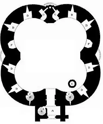 Clifford’s Tower ist von ungewöhnlicher Konstruktion. Der zweistöckige Turm hat den Grundriss eines vierblättrigen Kleeblattes mit vier runden Lappen. Jeder Lappen misst 6,5 Meter im Durchmesser und hat 3 Meter dicke Wände. An seiner breitesten Stelle erreicht der Donjon 24 Meter.[45] Ein quadratisches Torhaus von 6,5 Meter Breite schützte den Eingang auf der Südseite zwischen zwei der Lappen.[45] Zwischen den anderen Lappen gibt es Wehrtürmchen.[45] Große Konsolen und ein zentraler Pfeiler trugen das riesige Gewicht der Steine im Obergeschoss.[46] Gucklöcher von an York Castle einmaliger Konstruktion dienten als Schießscharten.[47] Eine Kapelle mit 4,5 Meter × 4,2 Meter Größe wurde über den Eingang gebaut, die auch als Fallgatterraum diente, so wie in Harlech Castle und Chepstow Castle.[48] Man denkt, dass der Turm als Versuch gedacht war, Flankenfeuer zu verbessern, indem man einen größeren Teil des Erdbodens von der Spitze des Donjons aus überblickbar machte. Zwar ist eine solche Konstruktion in England einmalig, sie ähnelt aber der in der Burg Étampes in Frankreich und könnte die Konstruktion des später entstandenen Donjons von Pontefract Castle beeinflusst haben.[37][49] König Heinrich beauftragte den Baumeister Henry de Rayns und den Bauschreinermeister Simon von Northampton mit diesem Projekt und die Kosten des Turmes machten einen Großteil der Gesamtkosten der damaligen Arbeiten an der Burg aus.[28][42]