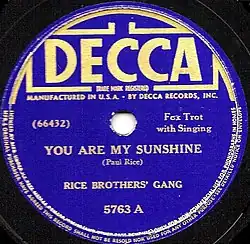 Die Urheberschaft von You Are My Sunshine ist umstritten. Sicher ist, dass die Originalaufnahme von den Pine Ridge Boys stammt. Das aus Marvin Taylor und Douglas Spivey bestehende Duo war jedoch nicht Autor des Songs, sondern Paul Rice hat ihn 1937 verfasst.[1] Paul Rice war mit seinem Bruder Hoke Mitglied der Rice Brothers Gang, die den Song erst drei Wochen später aufnahm. Ein Artikel in der Shreveport Times aus dem Jahr 1956 bestätigt, dass Paul Rice der Komponist gewesen sei.