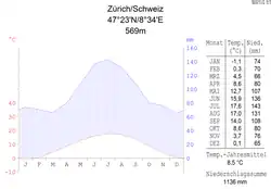 Die Jahresmitteltemperatur an der Messstation der MeteoSchweiz in Zürich (auf 556 m ü. M. am Hang des Zürichbergs und damit 150 m über dem Niveau des Stadtzentrums gelegen) beträgt 8,5 °C, wobei im Januar mit −0,5 °C die kältesten und im Juli mit 17,6 °C die wärmsten Monatsmitteltemperaturen gemessen werden. Im Mittel sind hier 88 Frosttage und 26 Eistage zu erwarten. Sommertage gibt es im Jahresmittel 30, während normalerweise drei Hitzetage zu verzeichnen sind. Diese Werte sind relativ niedrig im Vergleich zu anderen Mittellandstationen, was sich aufgrund der Höhenlage der Station erklären lässt. Im Limmattal sind im Jahresmittel deutlich mehr Sommertage und Hitzetage zu erwarten. Die Messstation Zürich weist im Mittel 1482 Sonnenstunden pro Jahr auf. Die 1136 mm Niederschlag fallen über das ganze Jahr verteilt, wobei im Sommerhalbjahr und speziell während der drei Sommermonate aufgrund der konvektiven Niederschläge höhere Mengen gemessen werden als im Winter.