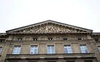 In dem dem Mittelrisalit aufgesetzten Dreiecksgiebel schuf Paweł Maliński[1] Allegorien auf die Industrie (Minerva), die Landwirtschaft (Ceres), den Handel (Mercurius), das Vermögen (Jason) und die Navigation (in Form von Personifikationen von Weichsel und Bug). Das annähernd rechteckige, rund 100 Meter lange Gebäude verfügt außerdem über Seitenrisalite.