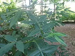 Die wechselständig angeordneten Laubblätter sind in Blattstiel und -spreite gegliedert und etwa 25 Zentimeter lang.[1][4] Die Blattspreite ist unpaarig gefiedert mit meist drei bis neun,[1] selten bis zu elf Fiederblättchen. Die 7 bis 8,5 Zentimeter lange Blattrhachis ist auf beiden Seiten 3 Millimeter lang geflügelt.[1][4] Die gegenständig an der Rhachis sitzenden,[1] fast sitzenden oder kurz gestielten, pergamentartigen Blättchen sind bei einer Länge von 6 bis 10 Zentimetern sowie einer Breite von 2 bis 4 Zentimetern eiförmig-elliptisch bis lanzettlich[1] oder elliptisch-lanzettlich bis eiförmig-lanzettlich oder länglich[4] mit spitzem oberen Ende und ganzem oder gekerbtem Rand.[1] Es ist Fiedernervatur vorhanden mit 10 bis 28 Blattnerven auf beiden Seiten des Mittelnervs.[1] Beide Flächen der Blättchen sind rostfarben flaumig behaart bis fast kahl und die Öldrüsen sind unauffällig.[1]