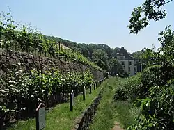 Zechstein: Herrenhaus mit Weinbergen, gleich rechts davon liegt das Hohenhaus. Links sind die ersten Schilder des Weinlehrpfads zu erkennen.