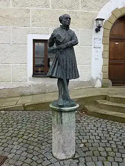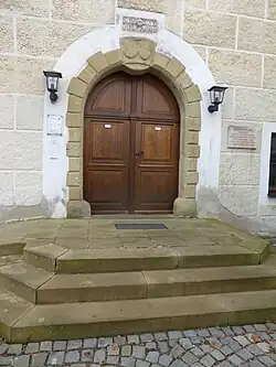 Vor dem Eingang befindet sich eine Bronze-Skulptur des Naturheilers Paracelsus, der einige Zeit am Hof der Stauffer in Beratzhausen verbracht hatte.
