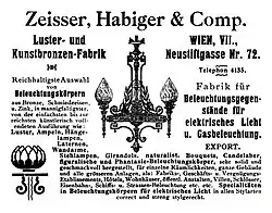 Zu diesem Zwecke wurde die Gesellschaftsfirma Zeisser, Habiger & Comp. gegründet (später: Gesellschaft für Beleuchtungskörper vormals Zeisser, Habiger & Comp.)[2]. Die Fabrik wurde an die Neustiftgasse 72 im VII. Gemeindebezirk verlegt und mit den modernsten Einrichtungen versehen. Die Betriebskraft wurde dem Kabelnetz der Wiener Elektricitäts-Gesellschaft (W. E. G.) entnommen und zahlreichen Elektromotoren zugeführt, die Arbeitssäle waren elektrisch beleuchtet. Auch wurde, um bei eintretender Feuersgefahr rasche Hilfe zu leisten, eine Feuermeldeanlage installiert.[1]