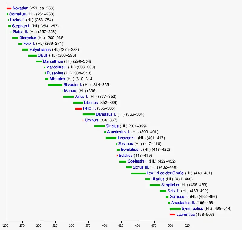 Päpste der offiziellen Liste sind in grün dargestellt, Gegenpäpste in rot. Zeitweise, wie zum Beispiel während des Abendländischen Schismas, gab es drei Päpste gleichzeitig, so dass in dieser Liste ein Papst in grün sowie zwei sich überlappende Gegenpäpste in rot aufgeführt sind. Zur besonderen Problematik der Zählweise der Päpste siehe auch Papst und Liste der Päpste.