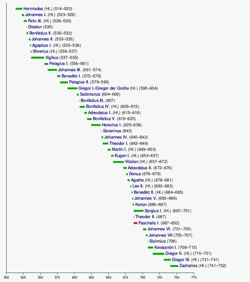 Zacharias (Papst)Konstantin I. (Papst)SisinniusJohannes VII. (Papst)Johannes VI. (Papst)Paschalis I. (Gegenpapst)Theodor II. (Gegenpapst)Sergius I.KononJohannes V. (Papst)Benedikt II.Leo II. (Papst)Agatho (Papst)DonusAdeodatus II.VitalianEugen I.Martin I. (Papst)Theodor I. (Papst)Johannes IV. (Papst)Severinus (Papst)Honorius I.Bonifatius V.Adeodatus I.Bonifatius IV.Bonifatius III.Sabinianus (Papst)Gregor der GroßePelagius II.Benedikt I.Johannes III. (Papst)Pelagius I.VigiliusSilveriusAgapitus I.Johannes II. (Papst)Bonifatius II.Dioskur (Gegenpapst)Felix III.Johannes I. (Papst)Hormisdas (Papst)