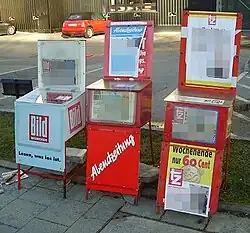 - ↑ Zeitungsautomat in Köln, Artikel thematisiert gefährdende Aufstellung.