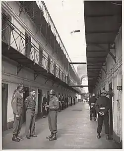 Angeklagte und Zeugen wurden grundsätzlich in verschiedenen Flügeln untergebracht. Während des Nürnberger Hauptkriegsverbrecherprozesses diente der Ostflügel als „Criminal Wing“ der Unterbringung der Angeklagten. Er war mit einem provisorischen Holzgang mit dem Ostbau des Justizpalastes verbunden, wo im Saal 600 der Hauptkriegsverbrecherprozess stattfand. Die Angeklagten befanden sich normalerweise in Einzelhaft und wurden von Soldaten permanent durch Luken in den Zellentüren bewacht, um Selbstmorde zu verhindern. Die Zeugen dagegen konnten sich in ihrem Zellenflügel, während des Hauptkriegsverbrecherprozesses war das der Nordostflügel, tagsüber frei bewegen. Männer und Frauen waren jedoch getrennt. Oft waren die Zellen im Zeugenflügel mehrfach belegt. Die Inhaftierten bereiteten ihre Aussagen vor, trafen sich zum Kartenspielen oder hielten Vorträge für andere Gefangene, beispielsweise in amerikanischer Geschichte. Wachsoldaten waren hier kaum eingesetzt.[4] Während der Nachfolgeprozesse wurden die zahlreichen Angeklagten und Zeugen auch im Nordwestflügel und im heute noch erhaltenen Westflügel untergebracht.