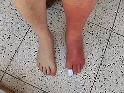 Ein charakteristisches Merkmal von Zellulitis ist ein Hautareal, das warm, geschwollen und schmerzhaft ist und an verschiedenen Körperstellen auftreten kann, einschließlich Händen, Füßen, Unterschenkeln und Gesicht.[5]