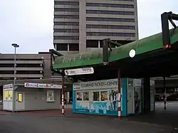 ![]() Der ZOB Hannover mit dem roten Servicecenter und überdachten Bussteigen (2014)