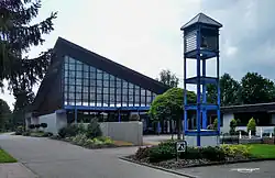 Die neue Einsegnungshalle mit dem charakteristischen Spitzdach, deren Bau 3.121.000 DM kostete, wurde im Sommer 1980 eingeweiht. Über einen Vorhof mit Brunnenanlage, dem Sammelplatz für die Trauergemeinde, wird die Halle betreten, die mit 130 Sitzplätzen rund 200 Personen Platz bietet. An die Einsegnungshalle und den Sammelhof schließen Aufbahrungsräume, Warteräume, Büro und Räume für Pfarrer und Träger an, im Untergeschoss sind Sozialräume, Heizung und Geräteräume untergebracht. Ein externer Glockenturm ist dem Komplex vorgelagert. Auf der Wegseite gegenüber steht eine Sonnenuhr aus Sandstein mit der Aufschrift „Licht klärt / Schatten lehrt“, das Meisterstück des Neunkircher Bildhauers Oliver Rinder.