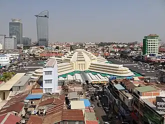 Der Zentralmarkt bildet das ungefähre geografische Zentrum der Stadt und ist als Orientierungspunkt bestens geeignet. Er breitet sich auf einem größeren Platz östlich des Monivong-Boulevards aus und besteht aus einem zentralen 26 Meter hohen Kuppelbau mit einem Durchmesser von 45 Metern und vier 44 Meter langen Gebäudearmen.[1]