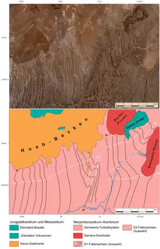 Die Geometrie der nicht-koaxialen D3-Strukturen zeigt hauptsächlich Verkürzung in Nord-Süd- und Nordwest-Südost-Richtung, was ebenfalls einen Zusammenhang mit der Einengung des Khomas-Ozeans bzw. mit der Kollision von Kongo-SF-Kraton und Kalahari-Kraton nahelegt. Zudem deuten verschiedene kleinmaßstäbige Verformungsindikatoren in den Gesteinen zumindest für bestimmte D3-Falten auf eine sinistrale Scherung während ihrer Entstehung hin. Da die Intensität der Deformation nicht in der gesamten Lower Ugab Domain gleich ist, sondern sich in bestimmten Bereichen konzentriert (bspw. im Bereich des sogenannten Bushman-Faltenzuges), wird vermutet, dass bei D3 duktile Scherzonen im Grundgebirge involviert waren. Zudem weichen die D3-Strukturen offenbar den beiden Syenit-Granit-Plutonen im Nordwesten der Lower Ugab Domain (Doros-Pluton und Voetspoor-Pluton[15]) aus bzw. legen sich an sie an, was nahelegt, dass die Plutone zum Zeitpunkt dieser Deformationsphase bereits in den Gesteinen des Zerrissene Turbidite Systems platzgenommen hatten. Das mit 540 bis 530 Ma ermittelte Alter der älteren (syenitischen) Teile des Voetspoor-Plutons[16] kann somit als Höchstalter für D3 herhalten. Die D3-Deformation ist zudem nur im Damara-Gürtel und im Südteil des Kaoko-Gürtels nachweisbar. Für die jüngste Deformation im nördlichen Teil des Kaoko-Gürtels, die der D1-D2-Deformation entspricht, ist anhand der Datierung dortiger synkinematischer Intrusionen ein Alter von rund 550 Ma ermittelt worden.[12] Daraus folgt, dass die Kollision des Kalahari-Kratons mit dem Kongo-SF-Kraton, anders als die des Rio-de-la-Plata-Kratons mit dem Kongo-SF-Kraton, erst deutlich nach Anbruch des Kambriums abgeschlossen war.