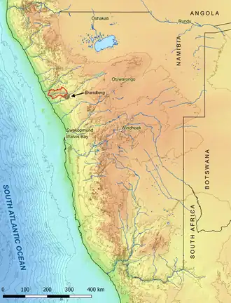- ↑ a b J. F. B. Jeppe: The geology of the area along the Ugab River, west of the Brandberg. PhD-Thesis, Faculty of Engineering, University of Witwatersrand, 1952 (online), Kartenskizze auf S. 9 (Fig. 2) und S. 17.