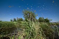 Auf der Website des Wilson Center wies der Ökologe Oleh Lystopad darauf hin, dass während der Überschwemmung viel Müll in Richtung zum Schwarzen Meer gespült worden sei. Experten zufolge wird die Zerstörung des Staudamms Auswirkungen auf die Entwässerung des Flussbetts des Dnipro haben, das große Mengen Sand enthält, mit möglichen Folgen wie Sandstürmen, einem beschleunigten Klimawandel und einer möglichen Desertifikation benachbarter Regionen. Die Halbwüste der Oleschky-Sande könnte dadurch vergrößert werden.[167] Laut dem Ökologen Alexey Vasilyuk hatten sich jahrzehntelang Industrieabfälle aus der Stadt Saporischschja, darunter eine große Menge an Schwermetallen, im Schlamm am Boden des Kachowkaer Stausees abgelagert, da es keine Strömung gab, die ihn wegschwemmen konnte. Diese Abfälle würden nun zum Teil mit der Strömung des Dnipro flussabwärts transportiert. Soweit sie auf dem nun freiliegenden Seeboden verblieben sind, würden die Schwermetalle vom Wind weggeblasen, wodurch sie von Pflanzen aufgenommen werden können, die von Menschen und Tieren verzehrt werden. Vasilyuk empfiehlt, der Ausbreitung dieser Metalle durch die Aussaat von Gräsern auf den kahlen Flächen entgegenzuwirken. Durch die Aussaat von Gras zur Begrünung, vorzugsweise solcher Sorten, wie sie für ukrainische Wiesen charakteristisch sind, könne auch die weitere Ausbreitung einer Wüstengegend über das Gebiet des Stausees hinaus vermieden werden.[168][107] Die natürliche Selbstbegrünung durch Samen aus den Sekundärsteppen wird mehrere Jahre dauern und den Seeboden während dieser Zeit lockern.[169] Die Gefahr von lokalen Staubstürmen wird teilweise durch Muschelschichten von Quagga-Dreikantmuscheln am Seegrund verringert, da diese stellenweise den getrockneten oder noch feuchten Schlamm bedecken.[170] Die Muscheln wurden in der Zeit vor 1957 mit Handelsschiffen in den See eingeschleppt und hatten dort keine natürlichen Feinde; wenn sie starben, blieben ihre Schalen zurück und bildeten Sedimente.[171] Einen Monat nach der Zerstörung des Staudamms besiedelten erste Pionierpflanzen wie der Portulak den Seeboden.[172] Anfang August waren Teile des Seebodens schon deutlich mit Gras bewachsen.[173] Laut Eduard Jewtuschenko, Leiter der Abteilung für Botanik und Ökologie der Nationalen Universität Krywyj Rih, ist die in den Medien und vom ukrainischen Umweltministerium bezeichnete „Wüstenbildung“ ein kurzfristiger negativer Effekt. Dass durch die Austrocknung des Stausees eine Wüste im Süden der Ukraine entstehe, sei ausgeschlossen. Mit der Zeit könne auf dem trockengefallenen Seeboden ein Biotop entstehen, das durch Sumpf, Wiese, Steppe, Salzpflanzen, Strauch- und Waldbewuchs gekennzeichnet sei. Die Funktionalität der europäischen submeridionalen Zone in diesem Gebiet könne dadurch verbessert werden, da es anstelle eines nahezu einheitlichen Biotops eines künstlichen Stausees mehr Biodiversität gebe. Aufgrund der bereits vorhandenen Begrünung des ehemaligen Stausees könne von Staubstürmen nicht gesprochen werden.[174] Laut der ukrainischen Umweltschutzorganisation UNCG hat sich ein Jahr nach der Zerstörung des Staudamms auf dem Grund des früheren Stausees ein neues Ökosystem gebildet. Das erste Mal seit 90 Jahren komme es wieder zu einer kräftigen Bewässerung des Nationalparks Welykyj Luh als Feuchtgebiet durch das Frühjahrshochwasser. Des Weiteren komme es zu einer Anspülung von Pflanzensamen, die zu einer Erholung der Vegetation beitragen. Es sei auf dem ehemaligen Seegrund ein Weidenwald von 2,5 bis 3,5 Metern Höhe entstanden.[175]