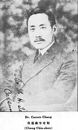 Der sozialdemokratisch orientierte Jurist Zhang Junmai (chinesisch 張君勱 / 张君劢, Pinyin Zhāng Jūnmài, auch „Carsun Chang“, 1887–1969) galt als eine der profiliertesten politischen Persönlichkeiten der Republik China.