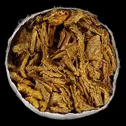 Dem natürlichen Tabak werden während der Zigarettenherstellung zahlreiche Stoffe zugesetzt. Der Tabakanteil in einer durchschnittlichen Zigarette liegt bei 700 mg.[7] Auch das Zigarettenpapier enthält Chemikalien. Viele im Tabakrauch befindliche Substanzen entstehen durch den Verbrennungsvorgang.