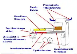 Die Zigarettenmaschine besteht aus einer Verteilereinheit (in der Skizze rechts zu sehen), in der vibrierende Schachtwände und Stachelwalzen für eine gleichmäßige Verteilung des per pneumatischer Förderung ankommenden Tabaks innerhalb der Verteilerbox sorgen (siehe Tabak-Sichter). Am unteren Ende der Box wird der gemischte Tabak fein und gleichmäßig auseinandergezogen. Dies erfolgt mitteils eines luftdurchlässigen, textilen Förderbandes (dem sogenannten Saugstrangförderer), das den Tabak aus der Verteilerbox gleichmäßig abzieht. Damit der Tabak auf dem Band bleibt, wirkt unterhalb des luftdurchlässigen Förderbandes ein Vakuum, so dass der Tabak auf das Band angesaugt und damit quasi fixiert wird. Am Ende des Saugstrangförderer befindet sich eine Überschussabnahmevorrichtung, bestehend aus zwei umlaufende Trimmerscheiben, welche überschüssige Tabakfasern vom Tabakstrang entfernen. Je nach Stellung der Trimmerscheiben zum Förderband, wird eine mehr oder weniger große Tabakmenge abgenommen. Der Tabaküberschuss fällt in einen Schacht und wird der Verteilereinheit wieder zugeführt.