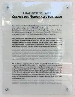 Anfang der 1930er Jahre kam es in der meist von Arbeitern bewohnten Straße zu heftigen Auseinandersetzungen zwischen Anhängern der KPD und Nationalsozialisten. Dabei wurden am 30. Januar 1933, dem Tag der nationalsozialistischen Machtübernahme, der SA-Führer Hans Maikowski und der begleitende Polizist Josef Zauritz in der Zillestraße unter nie ganz geklärten Umständen erschossen. Der Name der Straße wurde am 2. August 1933 in Maikowskistraße geändert. Im Prozess wurden 56 Personen aus dem linken Spektrum angeklagt und viele zu hohen Haftstrafen verurteilt, ohne ihnen eine Tatbeteiligung nachweisen zu können. Nach dem Zweiten Weltkrieg fanden sich starke Indizien, die auf den SA-Mann Alfred Buske als Mörder von Maikowski und Zauritz verwiesen. Eine weitere Auseinandersetzung nahm hier ihren Ausgang, als am 17. Februar 1933 Mitglieder der von Richard Hüttig angeführten Häuserschutzstaffel „Lange“ an der Kreuzung mit der Wilmersdorfer Straße auf zwei SS-Männer trafen. Bei den Auseinandersetzungen wurde der SS-Scharführer Kurt von der Ahé nahe dem SS-Lokal Koch in der Schillerstraße erschossen, wie das Gericht befand wohl vom SA-Mann Amor, der Ahé fälschlich für einen Kommunisten hielt. Trotzdem fällte das Gericht ein Todesurteil gegen Hüttig und hohe Haftstrafen gegen weitere Mitglieder der Häuserschutzstaffel.[5] Am Haus der Jugend in der Nr. 54 befindet sich eine Gedenktafel für die im Maikowski-Prozess und im Prozess zum Mord an von der Ahé wohl zu Unrecht verurteilten Charlottenburger Gegner des Nationalsozialismus.