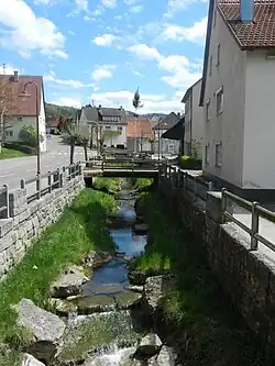 • (Zufluss aus dem Ludenstall), von links auf etwa 495 m ü. NN, 1,274 km. Entsteht an der Südwestspitze dieses Waldgewanns am Ständigen Brünnele (Gewannname) auf etwa 560 m ü. NN.
