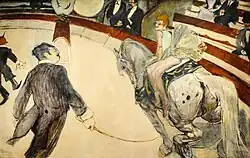 Lautrecs Bild ist Seurats pointilistischem Gemälde Der Zirkus von 1890/91 verpflichtet.[5] In seiner Version zeigt Seurat ebenfalls einen Schimmel. Der Dompteur tritt in exaltierter Haltung auf und schwingt die Peitsche in einer Weise, so dass das Pferd im gestrecktem Galopp voranprescht. Auf dem nackten Rücken des Pferdes ohne Dressursattel oder Decke balanciert eine Artistin in halsbrecherischer Weise auf einem Bein. Seurat versuchte mit besonders aufregenden Darbietungen die Attraktivität des Kollegen Lautrec zu übertreffen, z. B. indem er in der Manege einen Clown auftreten lässt, der mit waghalsigem Flickflack in die Höhe springt. Ein Clown im Vordergrund scheint von dem Auftritt so beeindruckt zu sein, dass er dessen Mut bejubelt.