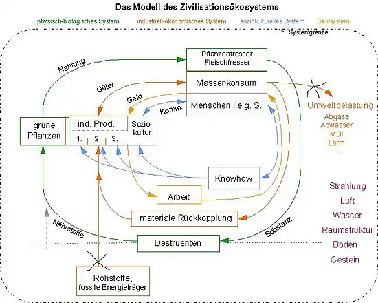 Nach dem ersten Bericht über Die Grenzen des Wachstums (1972) des Club of Rome erschienen in Deutschland politische Bücher wie „Ein Planet wird geplündert“ von Herbert Gruhl und „Leben und Überleben / Einführung in die Zivilisationsökologie“ von Harald Stumpf – letzteres mit teilweise wissenschaftlichem Anspruch.[1] Zivilisationsökologische Ansätze wurden daraufhin vor allem in den Geo- und Biowissenschaften, z. B. von Hartmut Leser und D. Panzer an der Universität Basel sowie im Tübinger Universitätsinstitut für Pflanzenphysiologie u. a. von Helmut Metzner weiterverfolgt.