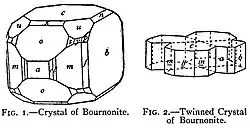 Das Bild zeigt eine schematische Darstellung der idiomorphen Flächen von Bournonit. In den Flächen a, e, l, m, f und b gibt es eine allen Flächen gemeinsame Richtung, die senkrecht zur c-Fläche verläuft. Daher gehören alle diese Flächen zur [001]-Zone.