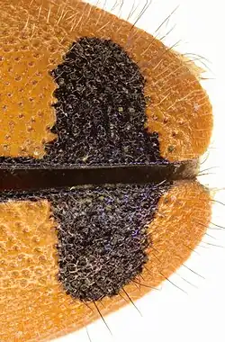 | Abb. 8: Ende Körperunterseite beim ♂, letztes Hinterleibs- segment zur Hälfte rot getönt | |