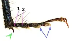 | Abb. 4: linker Hintertarsus Männchen von außen/schräg unten; 1,2: Nummer des Tarsenglieds, grüner Pfeil: Zähnchen an Tibiaende blaue Pfeile: Anhänge am 3., 4. Glied | |