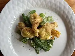 Eine andere Methode ist das Frittieren. Die vorbereiteten Zucchiniblüten werden einzeln in einen Ausbackteig getunkt und dann frittiert; sie werden als Hors d’oeuvre gereicht.[7]