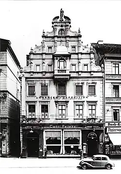 Zumindest in der Zeit zwischen 1803 und 1845 gehörte das Gebäude dann der Familie Nathusius und diente als Tabakfabrik. Etwa ab 1850 gehörte das Haus dem Kaufmann Fr. Overlach. Im Erdgeschoss wurden Umbauten vorgenommen, um Ladengeschäfte unterzubringen.[11] Spätere Eigentümer waren Schollmeyer und Boehme. Sie veranlassten 1882 und um 1890 weitere Umbauten. Das ursprüngliche Portal wurde dabei entfernt. In der mittleren Achse des unteren Giebelgeschosses wurde ein kleiner Erker angefügt, der mit einer geschweiften Haube bedeckt war. Im Erdgeschoss entstand eine Gaststätte. Eigentümer blieb alleine O. Boehme und ab Ende der 1930er Jahre seine Witwe A. Boehme. Im Haus wurde das bekannte Café Peters betrieben.