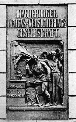 Im 20. Jahrhundert war das Haus Zum goldenen Greif Sitz der Magdeburger Lebens-Versicherungs-Gesellschaft. Der Bildhauer Otto Richter schuf zwei Bronzetafeln, die links und rechts des Eingangsportals angebracht wurden. Sie verwiesen mit allegorischen Darstellungen auf die Tätigkeitsfelder der Versicherung. Eine Tafel zeigte drei Parzen, Schicksalsgöttinnen, als Symbol der Lebensversicherung. Die andere Tafel stellte einen kräftigen Schmied dar, der plötzlich während der Arbeit von einem Todesengel abberufen wird. Es war für Hinterbleibende als Mahnung gedacht, rechtzeitige Vorsorge durch Abschluss einer Lebensversicherung zu treffen.[3] Im Haus befand sich das Blumengeschäft B. Spiecker sowie der Schuhladen Tack & Cie.